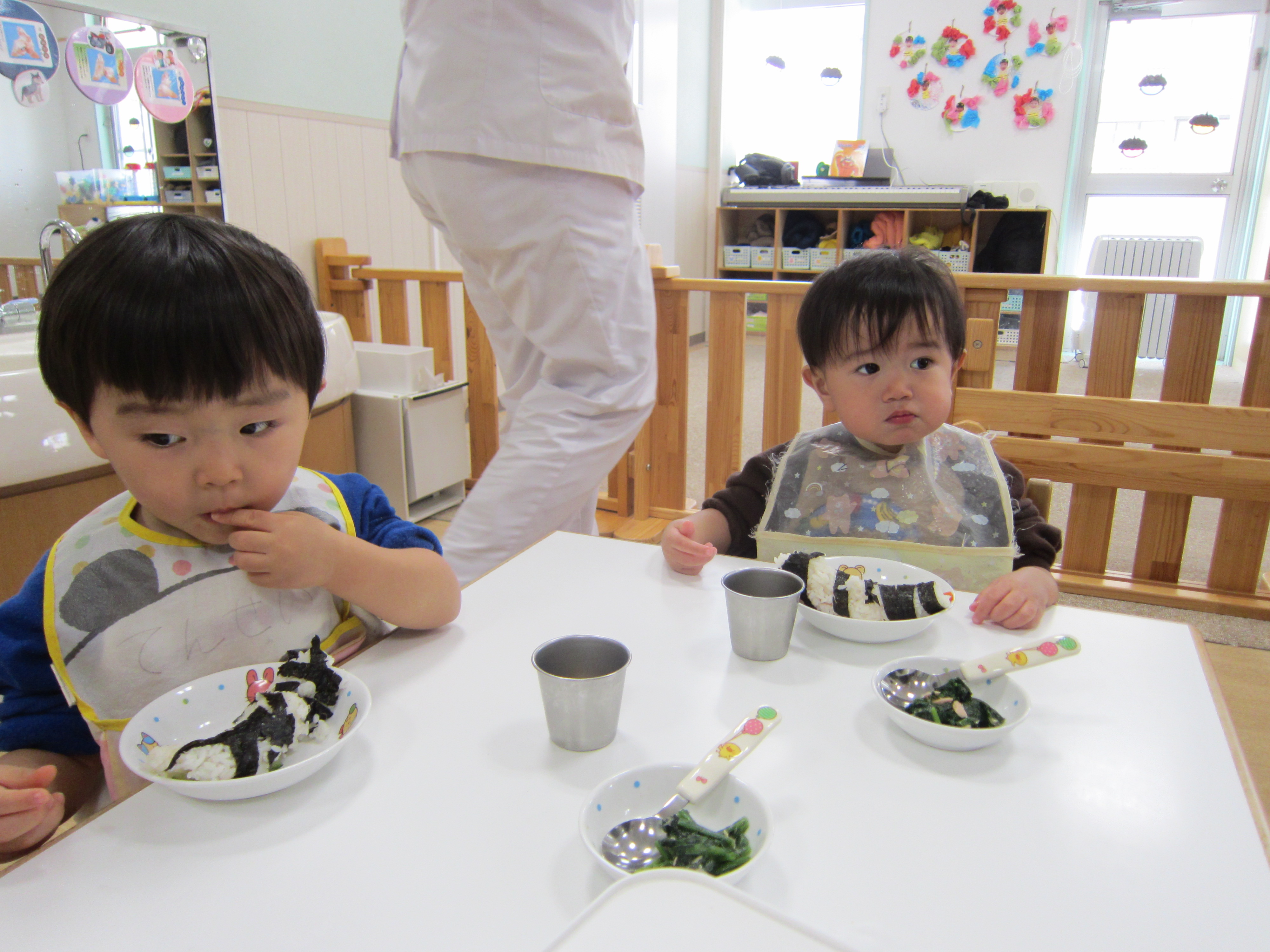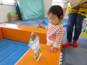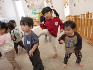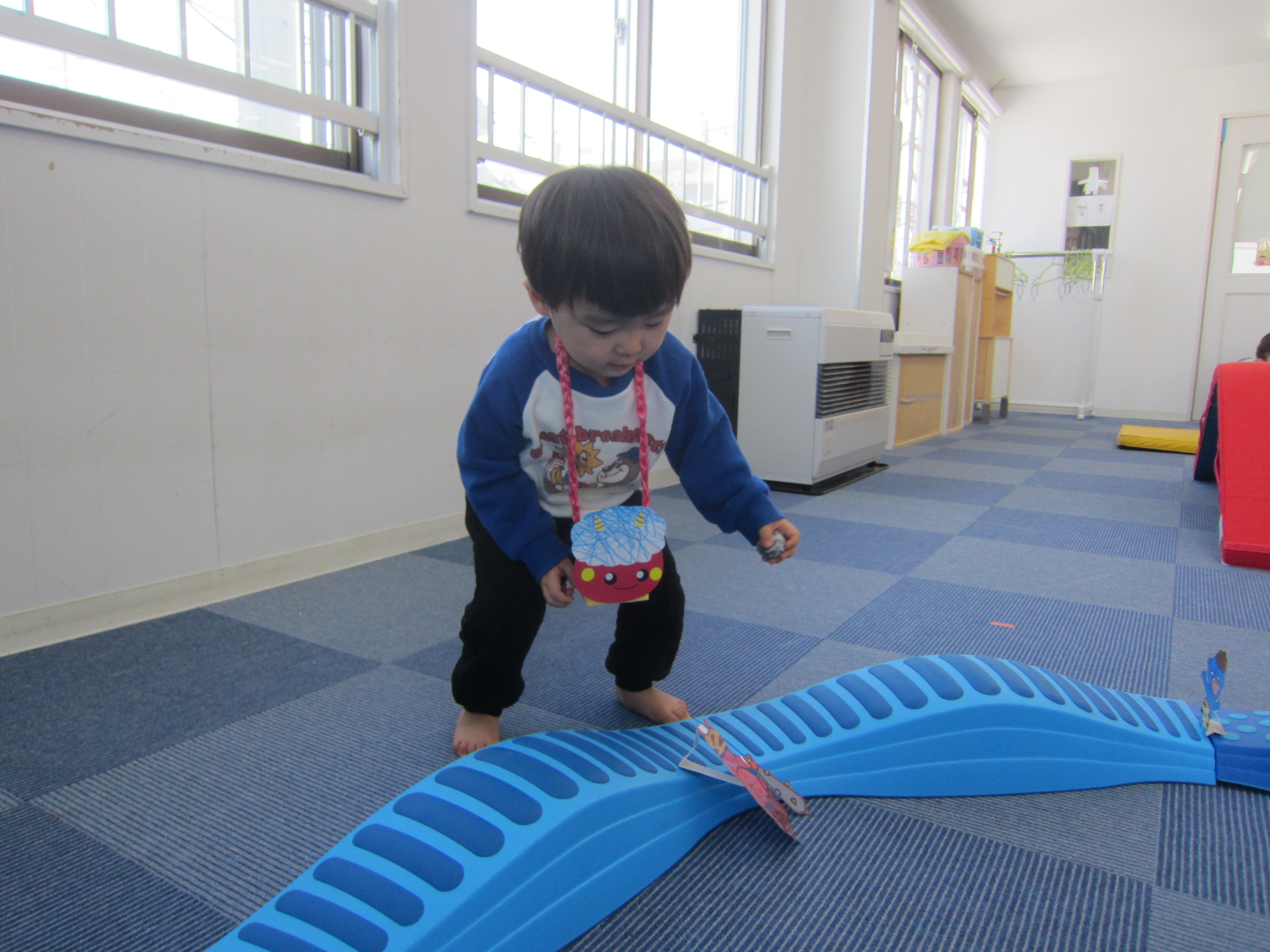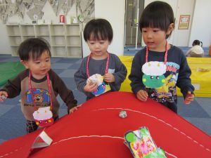 2階で遊び終え、階段を下りる途中「保育園にも鬼いるかな?」とお友だちの一言。恐る恐るお部屋に入り、いないことを確認すると一安心の子ども達😊