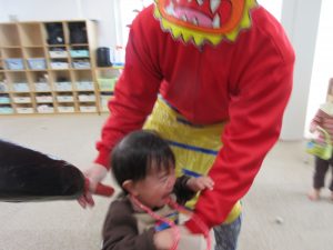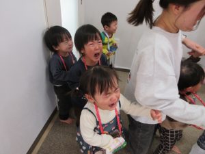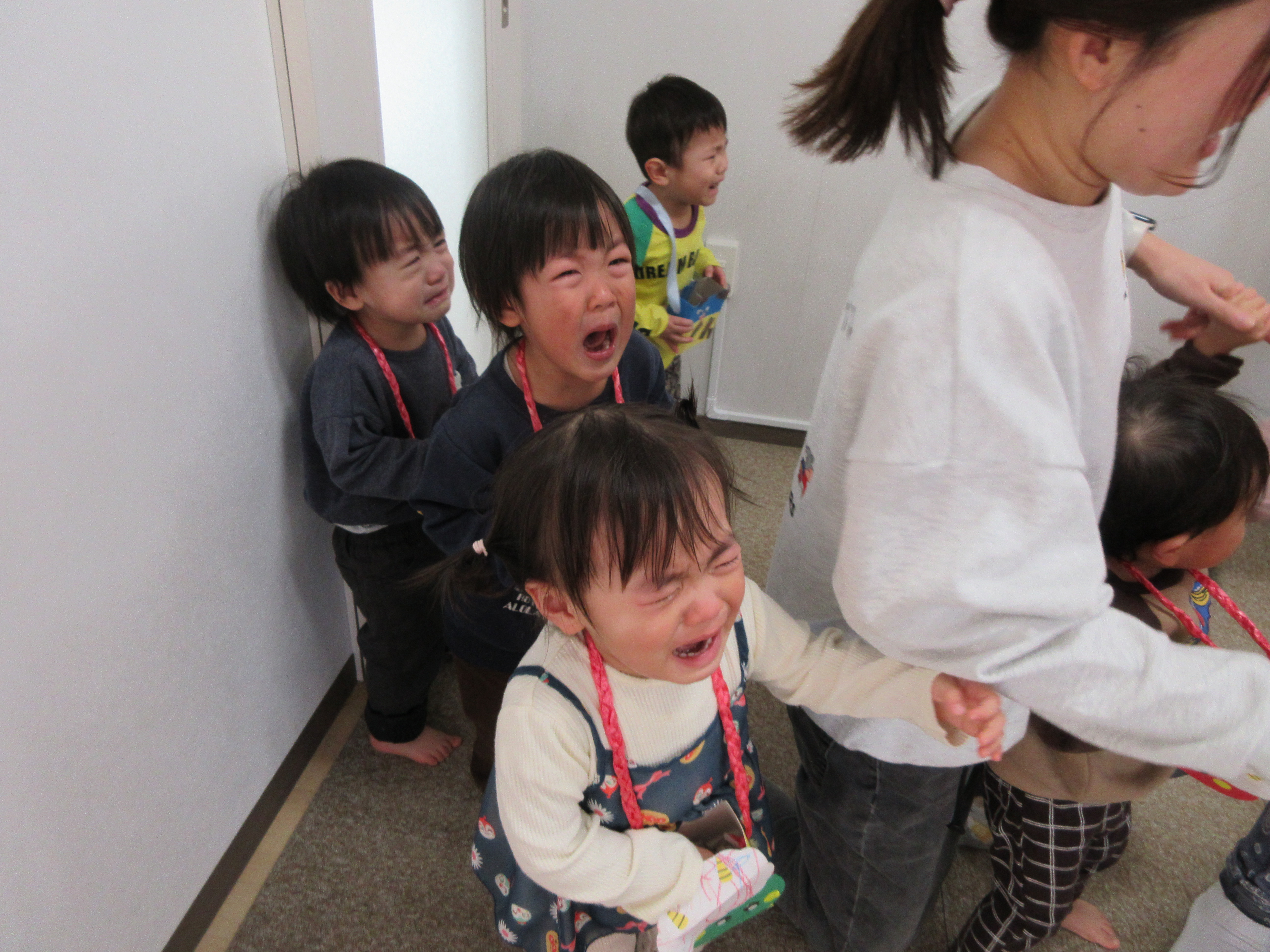 泣いたり先生の後ろに隠れたりしながらも持っている豆をまき、