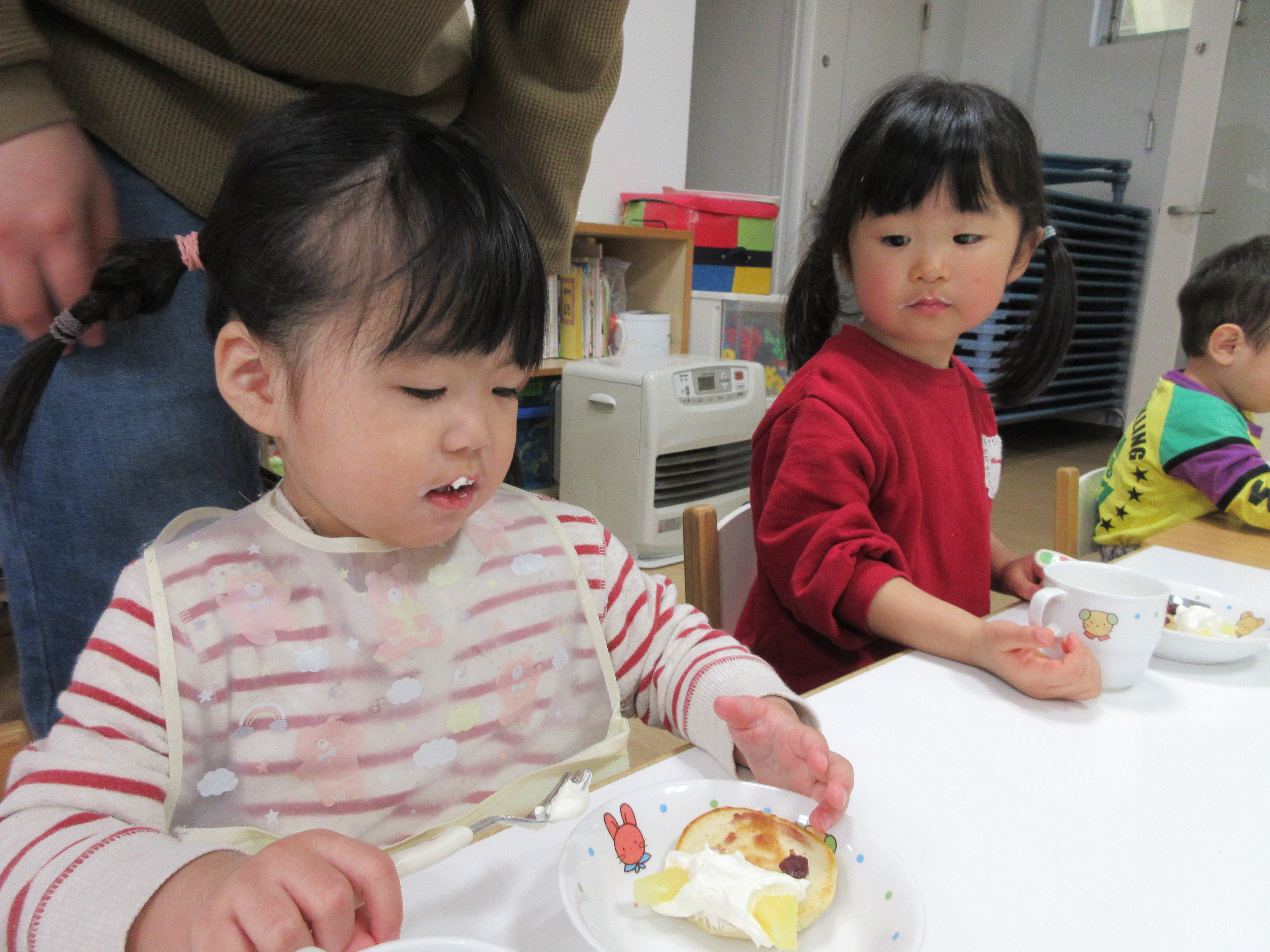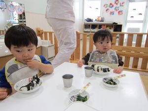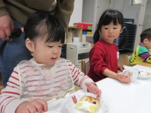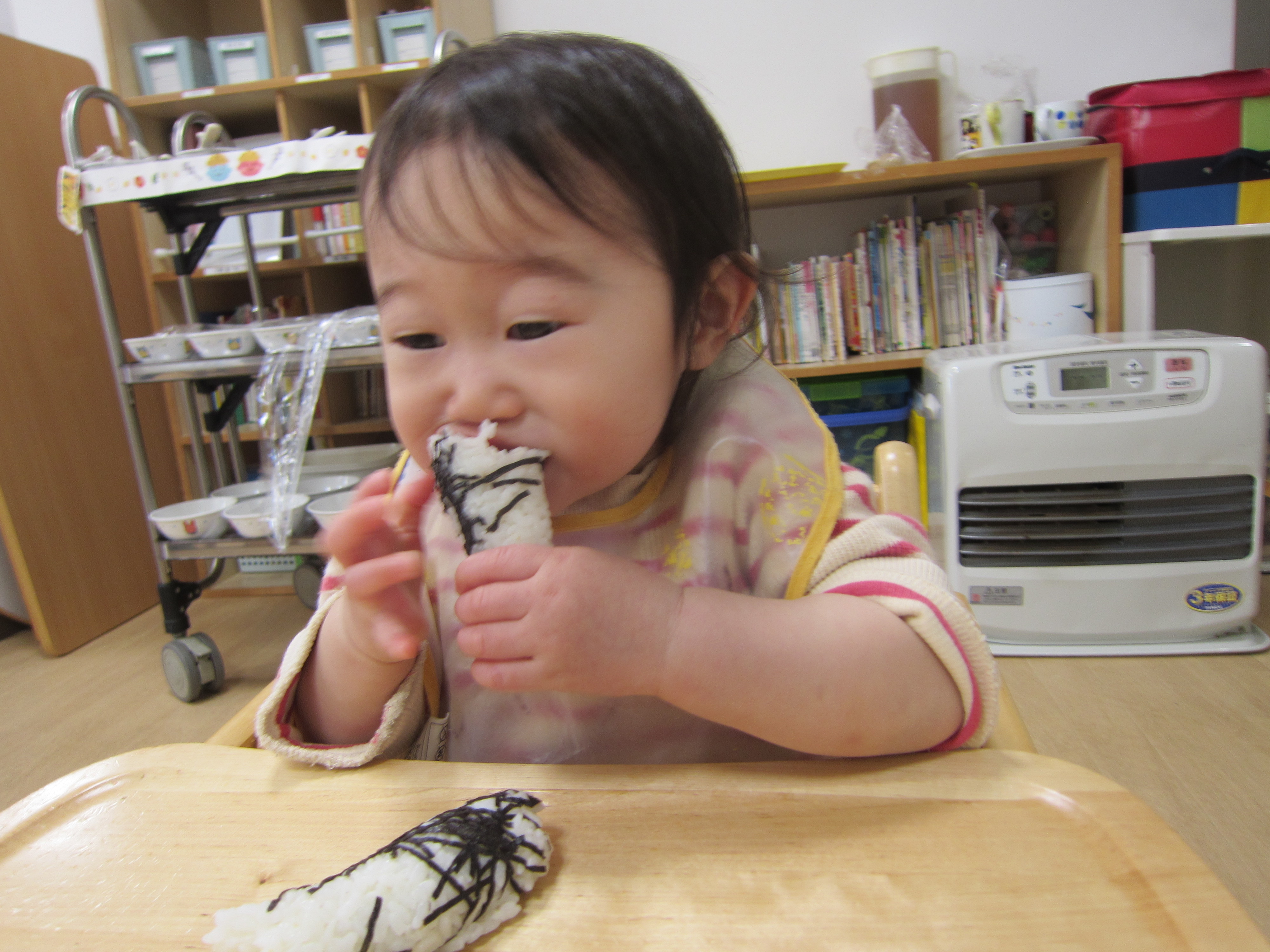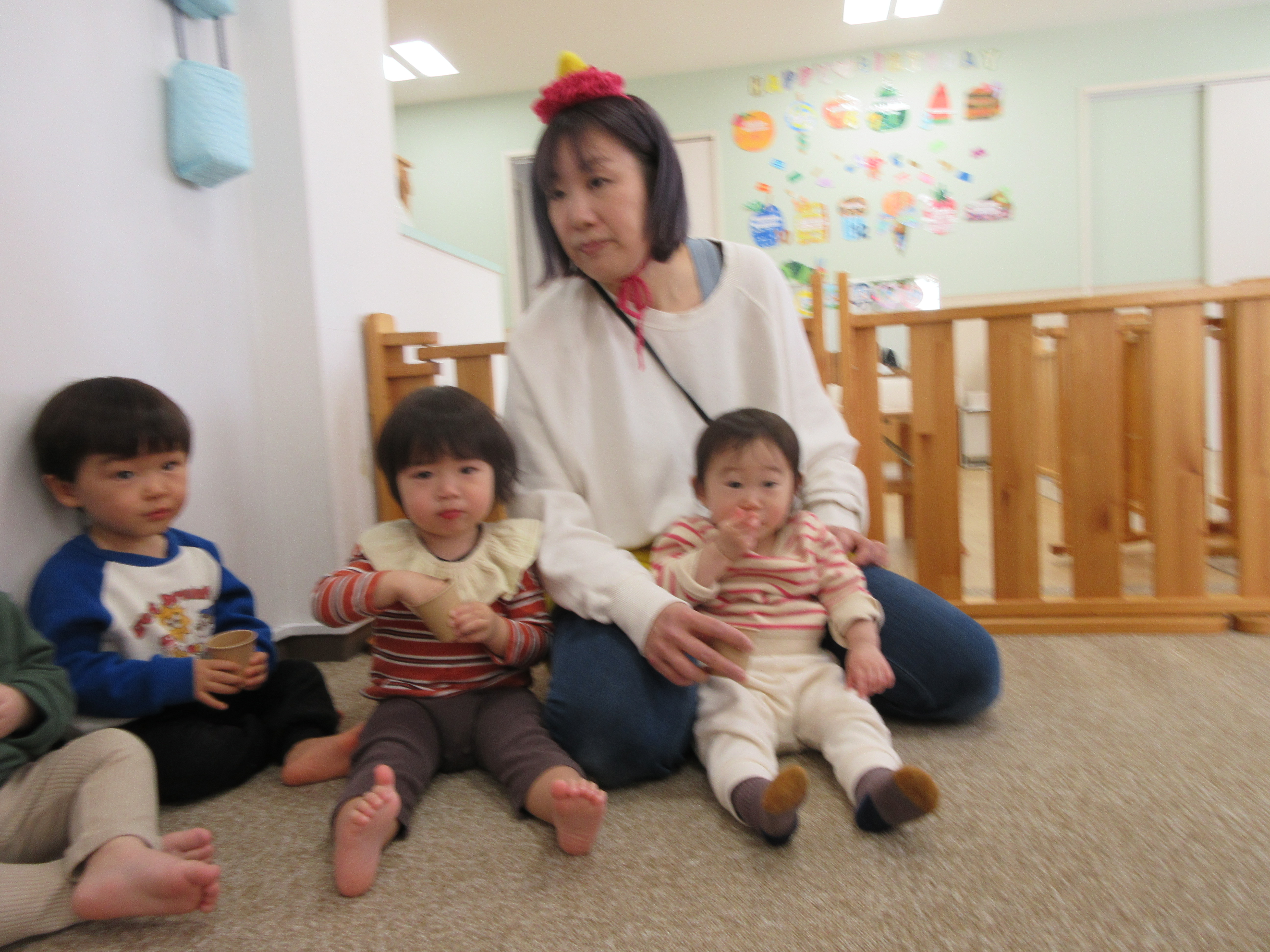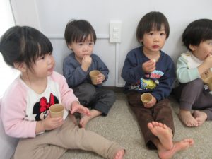 鬼退治後は、休憩しながら豆の代わりのポリコーンを食べ、「おいし~」と笑顔になる子ども達でした🤭