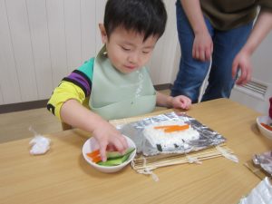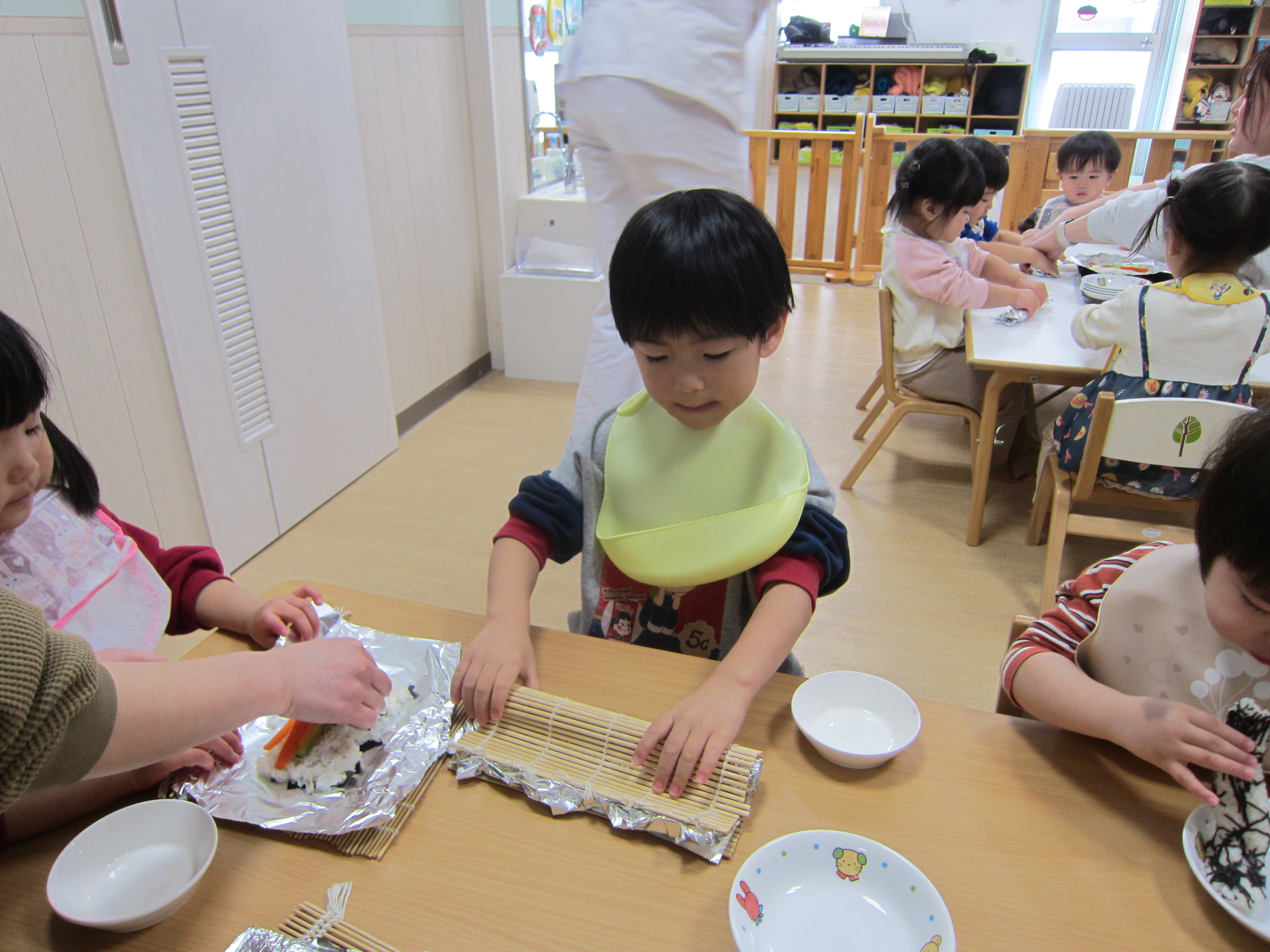 自分たちでギュっと巻いて出来た恵方巻にかぶりついていました!